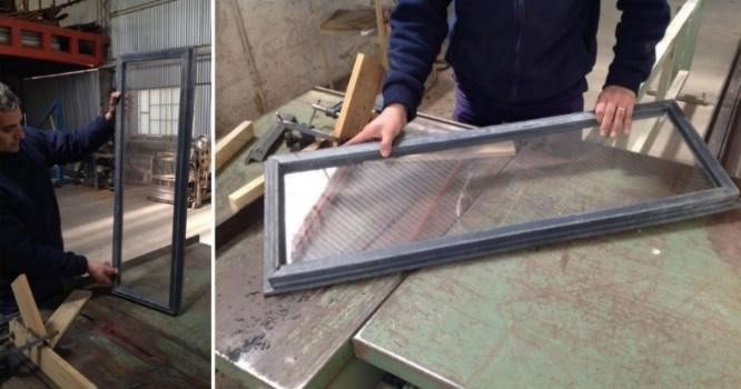 Procedimiento: se trituran los residuos plásticos hasta llegar a un tamaño máximo de partícula de 3 mm. Luego se pesan las partículas, se mezclan y se las introduce en una extrusora de simple husillo, donde se calientan con una temperatura promedio de 240 °C. Posteriormente se vierte la mezcla en un molde-guía de chapa plegada donde se completa el proceso de moldeado de los perfiles. Luego del enfriado, se desmoldan las piezas. Los perfiles se unen entre sí utilizando una máquina termofusora para caños plásticos, para conformar la ventana (Figura 5). Con este mismo procedimiento, con distinto molde, se pueden fabricar también tablas para usar en mobiliario.