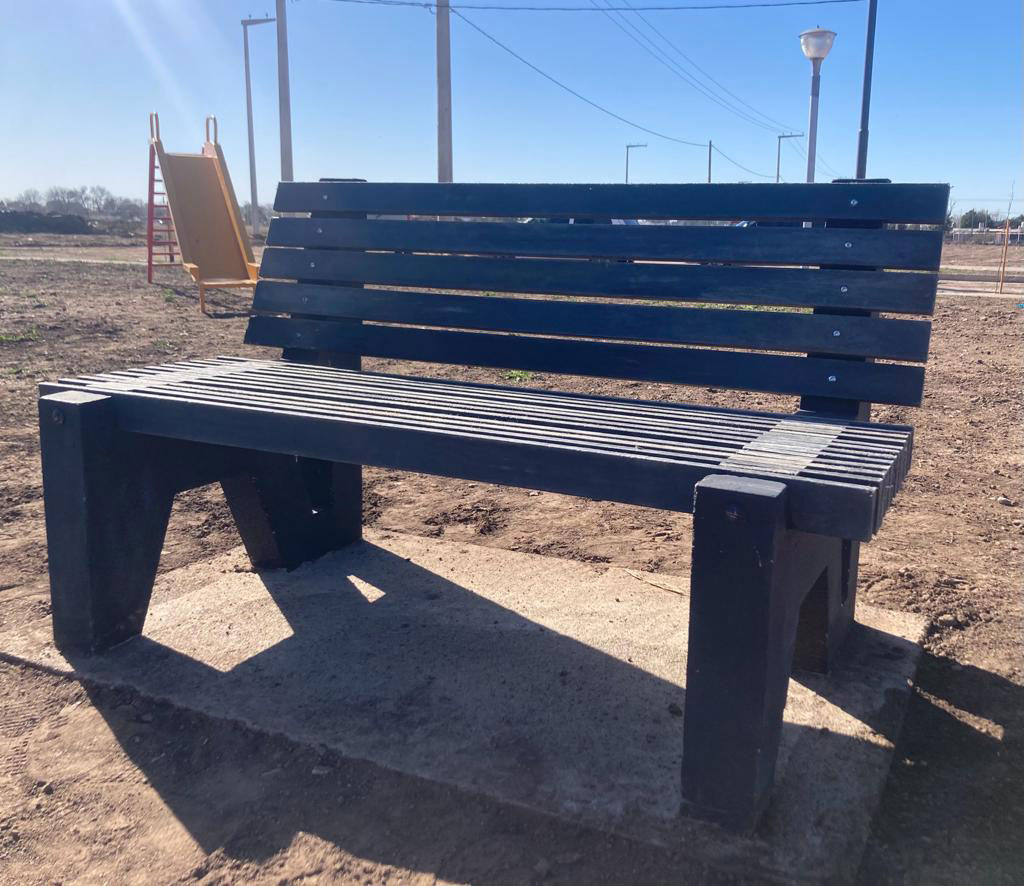 Banco de plástico reciclado en Plaza de Juárez Celman.