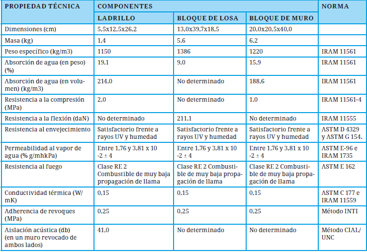 Ventajas: se destaca su mayor aislación térmica, con respecto a otros materiales de cerramiento (Tabla 1). Un muro de 15 cm de espesor con ladrillos de PET posee la misma aislación térmica que un muro de 30 cm de espesor con ladrillos de barro cocido. Son más livianos que otros componentes tradicionales (ladrillo común, bloque de hormigón). Son fáciles de cortar y aserrar (Gaggino, 2008).