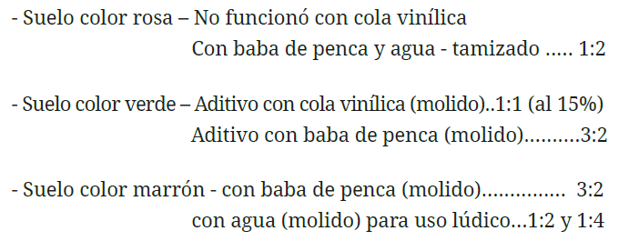 La mezcla de tierra con baba de penca no funcionó con ninguna de las proporciones ensayadas. La proporción 1:1 no llegó a niveles suficientes que permitan ligar el suelo con el aglutinante, mientras que la 1:2 mostró pequeños craquelados al secarse la pintura. La proporción 1:4 quedó craquelada con mayores grietas y tamaño que la proporción 1:2 y las proporciones 2:1, 4:1 mostró desprendimiento de la tierra del soporte.