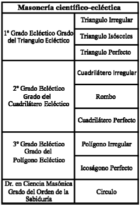 De un análisis superficial del material utilizado encontramos a autores del materialismo, del panteísmo y del socialismo, así como algunos de los primeros sociólogos he historiadores de las religiones, quienes iniciaron el estudio científico del cristianismo, lo cual hizo de ellos y sus obras un terreno de batalla entre el clericalismo y el librepensamiento internacional. Todo esto era condensado en los planes formativos oficiales de instrucción para los distintos grados y en los cuestionarios de exámenes para superar las pruebas orales de los talleres. En esta etapa elemental de la educación de los masones se otorgaban los tres grados del rito científico, el grado del triángulo ecléctico, del cuadrilátero ecléctico y del polígono ecléctico.