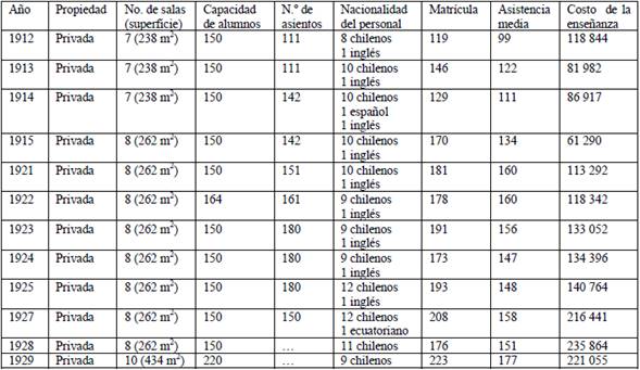Para efectuar su plan civilizatorio, el instituto contó con recursos materiales y humanos. Dentro de los últimos, el número de profesores y sus nacionalidades, y el número de alumnos y su asistencia media, fueron variables. Por ejemplo, el número de profesores estuvo dentro de los márgenes de nueve y trece, los que salvo excepciones fueron 99 % chilenos. La matrícula tuvo un incremento desde los 119 alumnos en 1912 hasta los 223 en 1929. Ello no quiere decir que el crecimiento fuese sostenido, pues en determinados años el número de matriculados era inferior al año anterior. El dinero fiscal destinado para su funcionamiento también fue fluctuante, aunque desde 1915 los capitales invertidos ascendieron constantemente. Una relación concreta de lo dicho se presenta en el siguiente cuadro.