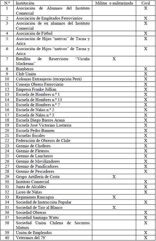 Todas estas colaboraciones de los scouts permitieron a sus coordinadores situarlos en el “escaparate” de lo social. De tal forma se mostraba, no solo a los paisanos, sino también a los enemigos militares (peruanos y bolivianos), que la infancia chilena estaba instruida militarmente. Además, se socializaba la chilenidad por contacto con otras instituciones civiles y armadas. El siguiente cuadro detalla las organizaciones con las cuales los scouts compartieron la ritualidad nacionalista.