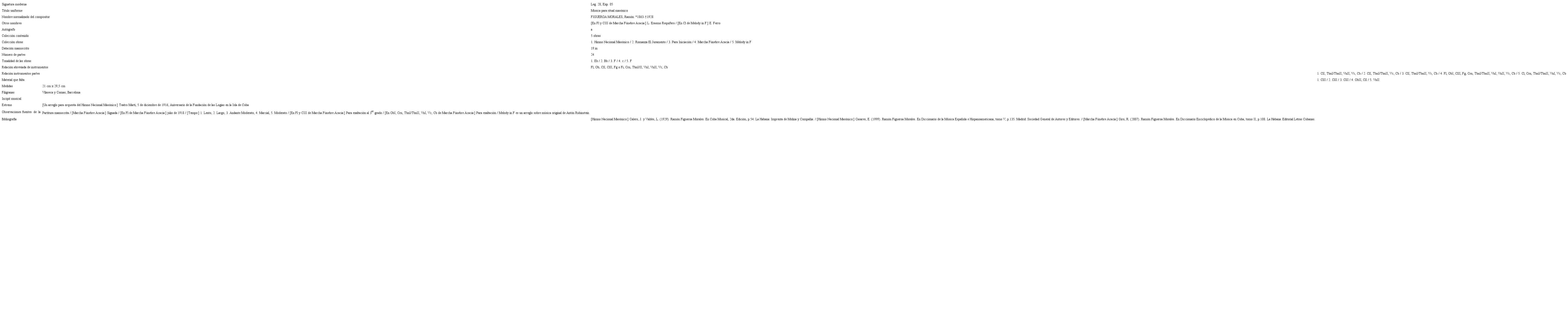 Específicamente para la elaboración de la ficha catalográfica de la Música para ritual masónico (ver Cuadro 2), no solo se tuvieron en cuenta los campos descriptivos del inventario, sino que se incluyeron otros campos resultantes de la adecuación de la Norma de Catalogación del Repertorio Internacional de las Fuentes Musicales (RISM) - España, serie A/II - Manuscritos musicales desde 160017, atendiendo al contexto musical cubano de principios del siglo XX y a las propias particularidades del objeto de estudio. Dicha norma ha sido ampliamente utilizada para la descripción de otros documentos de música anotada pertenecientes al archivo de música de la Catedral de Santiago de Cuba18 y a las danzas del compositor estudiado contenidas en el libro “Música de salón. Santiago de Cuba, siglo XIX. Danzas para piano”19. En este particular, para la conformación del catálogo del autor se adicionaron los siguientes campos descriptivos: