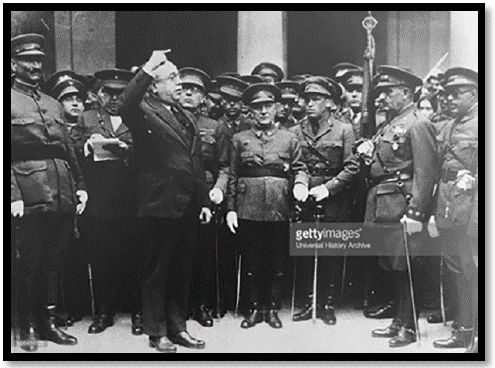 No se puede decir que el gesto de la Imagen 3 sea un signo masónico, ya que vemos la segunda mano del político. Este gesto da un aspecto patriarcal al orador que tiene más que ver con la oratoria clásica que con la masonería ya que antiguamente el orador hablaba desde una superioridad moral, ética o política que incluía el gesto de señalar lo que no se debe hacer o ser, entre otras muchas cosas. La imagen 3 pertenece a una página web dedicada al político. En la Imagen 3 los ojos y la boca del político reflejan tristeza porque España estaba en guerra civil o a punto de estarlo. Vemos en la imagen 4 del archivo Getty Images a Azaña con el dedo dirigiéndose a los militares de una academia militar en 1932. Está imagen es anterior al inicio de la guerra civil española. Algunas de las figuras militares le prestan atención, pero la segunda figura a la derecha le está haciendo caso omiso al político y parece estar concentrado en el fotógrafo y en la cámara que les dispara. Si hay algo que refleja esta imagen es la división en el seno del ejército, como se ve ante la reacción de estos militares hacia el representante de la República española.