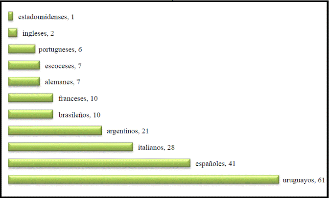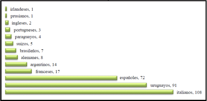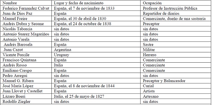 Respecto a las nacionalidades, la evidencia documental demuestra que 12 de los 25 miembros nacieron en Uruguay, mientras que los restantes son provenientes del extranjero, principalmente de España e Italia. Esto último no es ninguna sorpresa si se analizan los índices de inmigración del Uruguay a mediados del siglo XIX.