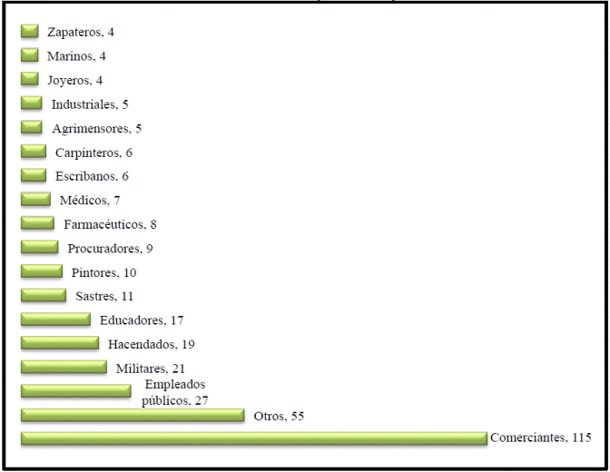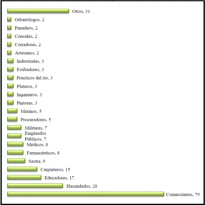 Sobre las ocupaciones, destaca el grupo de los comerciantes que eleva a 12 el número de integrantes, casi la mitad de la composición de la logia. Sin embargo, llama la atención la baja presencia de hacendados, considerando que se trata de un taller masónico del interior del país y en un departamento con fuerte tradición agropecuaria.