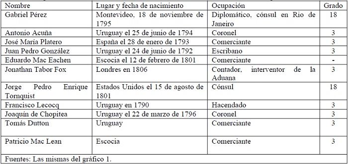 Según este cuadro las profesiones existentes son heterogéneas y pueden catalogarse en distintos grados sociales. Destacan las ocupaciones de sastre, herrero, repartidor de diarios y artesano junto con comerciantes y militares de escala social superior. Esta es la evidencia que demuestra que la masonería uruguaya del siglo XIX no absorbía solamente a miembros pudientes o exclusivamente aristocráticos sino que, por el contrario, pueden hallarse masones de extractos socio-económicos bajos y medios.