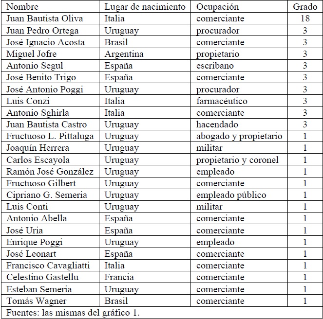 La masonería uruguaya se establece institucionalmente en 1856 y la logia Santa Rosa de Lima se crea en el interior del país un año más tarde. Observemos su relación de integrantes.