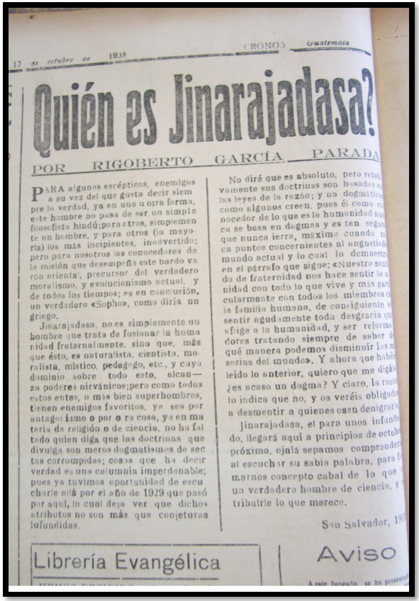 La Época. “Mañana llegará a Tegucigalpa el filósofo C. Jinarajadasa”. 15 de octubre de 1938.