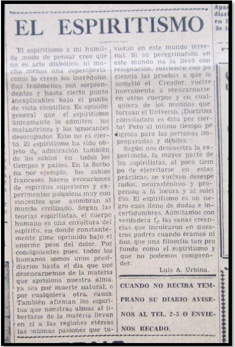 Urbina, Luis A. “El espiritismo”. Diario Nuevo. 3 de agosto, 1938.