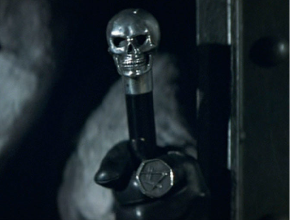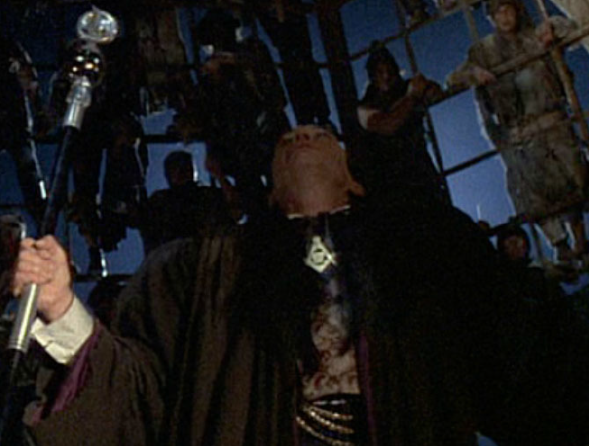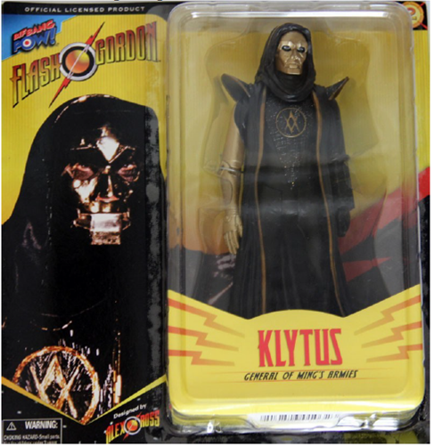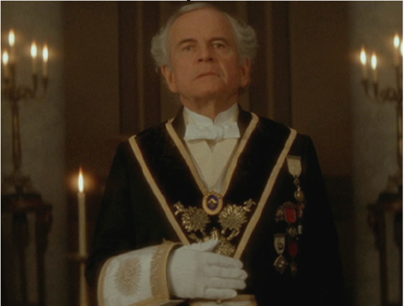 En Flash Gordon (1980) -película que me encantó en mi infancia pero que no he vuelto a ver desde entonces- el enigmático general Klytus, mano derecha del malvado emperador Ming, usa como distintivo un emblema bordado en oro en el pecho que, sin lugar a dudas, está inspirado en la escuadra y compás masónicos. Cabe destacar que el general Klytus no forma parte del reparto original de Flash Gordon escrito por Alex Raymond, sino que fue un personaje inventado para esta versión cinematográfica por parte del guionista Lorenzo Semple. La única información disponible sobre el traje de Klytus es que fue diseñado por un equipo de vestuaristas que, en algún momento, trabajó con Fellini. Por tanto, no queda claro si la idea de bordarle una insignia inspirada por la escuadra y el compás fue del diseñador de vestuario, del guionista o del director.