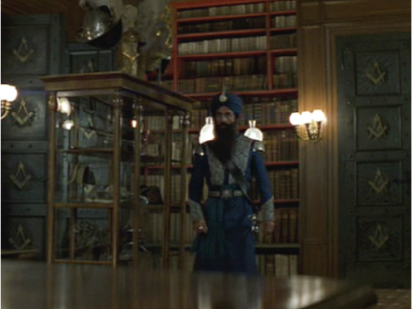 Una película que resultó un desastre financiero y que, además, no tuvo una buena recepción ni entre el público ni por parte de la crítica -pero que yo, debo confesar, disfruté muchísimo-, fue The League of Extraordinary Gentlemen (2003). Basada en la serie de cómics escritos por Alan Moore -ojo con este nombre-, la trama gira en torno a las aventuras de un equipo formado por personajes de la literatura -el Capitán Nemo, Allan Quatermain, Mina Harker, el Hombre Invisible, Dorian Gray, el Doctor Jekyll y Tom Sawyer- que tiene como objetivo detener a Fantom, el villano que pretende iniciar una guerra entre Gran Bretaña y el Imperio Alemán para vender armas a ambos bandos. El equipo está formado por el misterioso personaje llamado simplemente M, que resulta ser Moriarty -el archienemigo de Sherlock Holmes-. Pero, al final, se descubre que M/Moriarty y Fantom son el mismo. En tres escenas se dan las pistas para hacer la conexión entre M y Fantom. En primer lugar, cuando se reúnen por primera vez los miembros de la liga con M, la puerta de acceso a la biblioteca de éste se encuentra adornada con símbolos de la escuadra y el compás. En otras dos tomas aparece Fantom, pero lo único que vemos de él es su mano enguantada y el enorme anillo con la escuadra y el compás que lleva en un dedo.