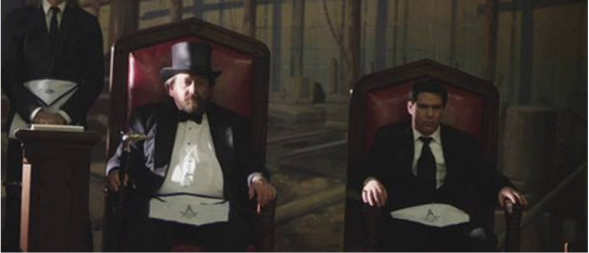 En segundo lugar, se podría decir que son también no-diegéticos todos esos elementos que quedan claros para el espectador y ocultos para los personajes dentro del filme. Y que, en ocasiones, resultan dando un giro a la trama cuando se convierten en diegéticos. En el caso de la masonería, que en ninguno de los casos anteriores llega a ser un plot-twister, se podría argumentar que su inclusión en los filmes responde al proceso de enunciación que, a decir de algunos teóricos y críticos de los años 60, 70 y 804[4] del siglo pasado, estructura la relación del espectador con el filme y que -por ende- lo enunciado es producto de la enunciación y de su lugar ya que, al igual que el lenguaje, es una construcción social.