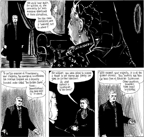 El largometraje presenta a los masones como los autores intelectuales de los asesinatos, perpetrados con el fin de encubrir al heredero al trono, que a su vez también es masón y nos lleva a inferir que la reina Victoria no estaba al tanto del plan de la hermandad. Pero en la obra de Moore la conspiración comienza precisamente con la monarca, quien se entera que su nieto tiene una hija ilegítima y católica. Ello gracias a que las amigas de Ann Crook, las prostitutas de Whitechapel, han caído en la cuenta de la verdadera identidad del padre de Alice y pretenden chantajearla. La reina pide a sir William Gull -su médico y hombre de confianza- que se encargue de eliminar las amenazas en contra de la estabilidad de la monarquía británica. Gull es masón y mueve sus influencias con sus hermanos para llevar a cabo su plan sin contratiempos. En el filme, sir Charles Warren, el jefe de la policía londinense y superior directo del inspector Abberline (Johnny Depp), encargado del caso, se encuentra iniciado y está al tanto de todo desde un principio, por lo que trata de desviar la atención de su subordinado sugiriéndole que investigue a los judíos o a un grupo teatral de nativos americanos que están de paso por Londres como posibles autores de las muertes. En la novela gráfica, Gull ya tiene el plan de asesinar a las prostitutas cercanas a Ann Crook y acude con Warren a explicarle todo. Warren se rehúsa a asistirlo, pero Gull juega la carta masónica: el deber del jefe policiaco es ayudar a su hermano a ayudar a otro hermano y guardar el secreto. Warren cede y asigna el patrullaje de Whitechapel a policías que también son masones y sabrán guardar silencio. Así, mientras que el filme presenta a la masonería como el cerebro del plan, el texto la pone como un mero instrumento.