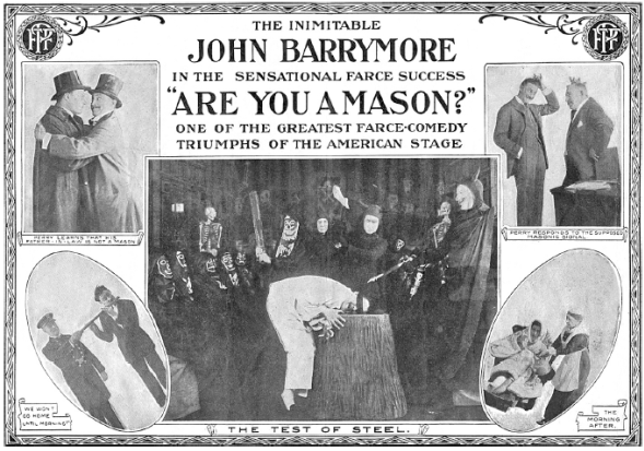 Otros medios de comunicación de masas -como el cine- se habían enfrentado, desde inicios del siglo XX a la problemática de cómo afrontar lo masónico. Entre los ejemplos, se pueden mencionar la comedia Are you freemason? (1915), así como otra versión homónima de años más tarde (1934), inspiradas en una obra teatral alemana homónima (Figura 1). En la obra de 1915, dirigida por Thomas N. Heffron, vemos a John Barrymore (1882-1942). El protagonista es Frank Perry, un excéntrico alcohólico, trata de convencer a su esposa que su borrachera idiosincrática es parte de los rituales masónicos de iniciación2.