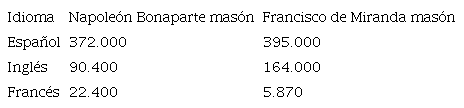 Tal como se muestra en la tabla 1, cuando indagamos en Internet, el motor de búsqueda de Google propone 372.000 resultados en español para la entrada “Napoleón Bonaparte masón” que contrastan con los 90.400 en inglés o los 22.400 en francés. De igual manera los resultados para similar búsqueda respecto a Francisco de Miranda son los siguientes: 395.000 en español, 164.000 en inglés y 5.870 en francés. Parece que los más discretos al respecto son los franceses y los más desbordantes en lo improbable, los hispanohablantes, en una cuestión que no admite dudas al menos hasta el sol de hoy. Ni Napoleón Bonaparte ni Francisco de Miranda, salvo que se pruebe lo contrario, fueron francmasones. La única manera de demostrar de forma tangible la pertenencia a la masonería es la presentación del diploma de masón o documentos probatorios de iniciación o asistencia a tenidas en las logias que para el caso de Napoleón y de Miranda son inexistentes. Tampoco vemos el interés que tendrían las logias implicadas en la iniciación de estas connotadas figuras de mantener en secreto su pertenencia.