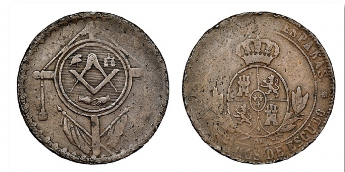 Asimismo, cuatro de ellas están acuñadas en plata, mientras que la de la Logia Maestral Fraternidad Ibérica n.o 90 aparece en la descripción del catálogo como de “metal blanco”. Por su parte, la moneda resellada es de bronce conforme al tercer sistema monetario de Isabel II, basado en el escudo y sus divisiones en céntimos50.