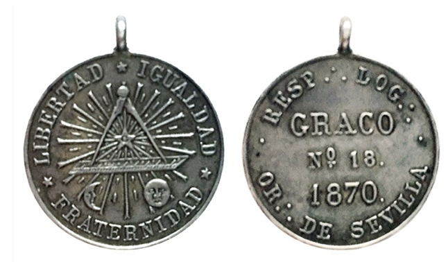 Reverso: En campo central leyenda en tres líneas: GRACO, Nº.18., y 1870, y alrededor: RESP.·. LOG.·. y OR.·. DE SEVILLA. Con listel en ambas caras.