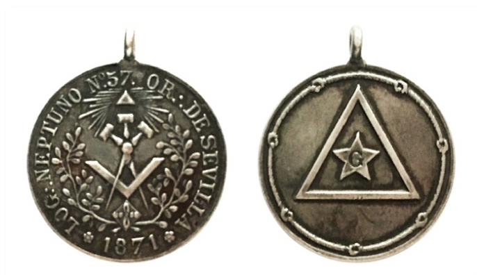 Anverso: En campo central, escuadra y compás rematado en tres malletes, debajo del conjunto el símbolo de la ciudad de Sevilla (NO-DO), y arriba triángulo radiante. Todo rodeado por corona de hojas de acacia. Alrededor leyenda: LOG.·. NEPTUNO N.º 57. OR.·. DE SRVILLA, abajo: 1871.
