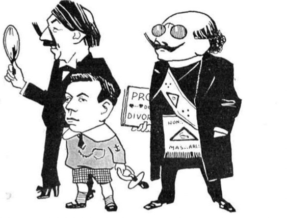 En la nota de Caras y Caretas que acompaña la caricatura puede leerse una referencia al proyecto de divorcio que presentaría Conforti en 1911, pero que nunca llegó a tratarse en el recinto parlamentario, quedando estancado en la comisión de legislación:36
