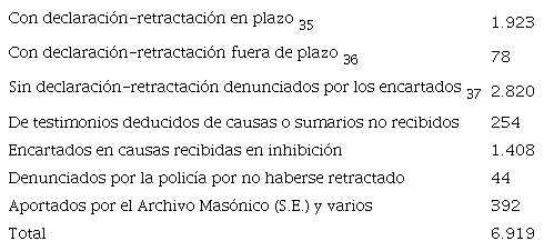 Se debería descontar los fallecidos antes de 1940 por causas naturales, a consecuencia del conflicto bélico o víctimas de la represión de cualquier bando y tipo. Utilizando los expedientes remitidos desde Salamanca extraídos de la documentación incautada a gran parte de las logias, pero no a todas, el TERMC procesó por masonería al menos a 27,000 personas entre los 64,416 expedientes incoados. Entre ellas hubo fallecidos antes de que se abriese el plazo para presentar la declaración, pero al comprobarse el deceso (si era posible) se dictaba el sobreseimiento definitivo pues la responsabilidad penal se extingue con la muerte. Esto dificulta establecer la relación entre procesados y retractados, pero es un indicio bastante elocuente.