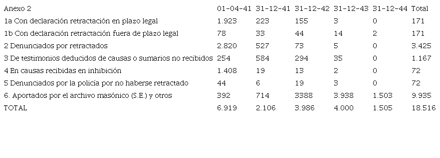 Basándonos en el criterio del ingreso en la orden con los límites expresados, con seguridad fueron varias docenas de miles los masones que tenían la posibilidad de declarar. Conocido con exactitud el número de retractados, pero apenas intuida la población total que pudo acudir al requerimiento, podríamos quedarnos, a modo de hipótesis, con la idea de un máximo del diez por ciento de quienes podían hacerlo cumplió el requisito.