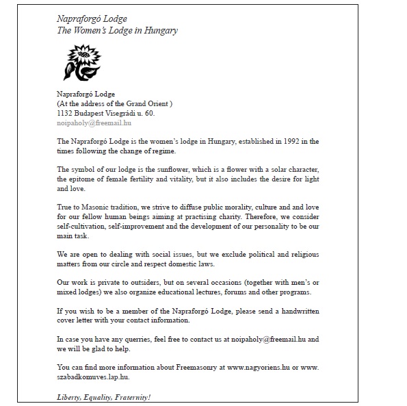The Napraforgó34 Lodge was founded on May 12, 1992, with the help of the Hungarian mem-bers of the Paris Lodge, La Rose des Vents (Wind Rose) under the protection of the Women’s Grand Lodge of France and was allocated serial number 245. Their first Worshipful Master Ms. M. Ny. was elected, being an active member of the lodge to this day. The French Grand Master Marie-France Coquard35 herself was present at Bringing in the Masonic Lights.