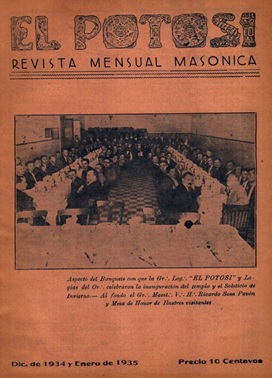 Después de un período de reorganización, en la década de 1930 la masonería potosina pasa a mostrarse como organización progresista que fija la mirada del espectro social, germen de difusión de la doctrina. Para ello, es vital mencionar la campaña emprendida entre 1933 y 1934, por la Gran Logia del Potosí, a través de comunicados a diferentes asociaciones masónicas nacionales, organizaciones gubernamentales y la edición de un timbre postal para que el piloto aviador Severiano Pulido Ortiz acompañe al piloto aviador Sarabia en el vuelo México-Sevilla (España), con el fin de enaltecer a la masonería ante la mirada pública y la participación con el apoyo moral y económico a los exiliados españoles durante el conflicto de la guerra civil española. De manera interna, en el edificio se inauguran dos murales: el primero en un área común, emulando decoraciones y representaciones prehispánicas. El segundo en 1934, al interior de un espacio dedicado a la realización de actos rituales. Éste se caracteriza por ser construido con base en la simbología masónica, a mano de Felipe Moreno Díaz13. En este momento aparece El Potosí. Revista mensual masónica con la dirección de Ricardo Sosa Pavón, dejando ver el crecimiento y organización hacía la perspectiva pública y privada que permiten trazar líneas de estudio.