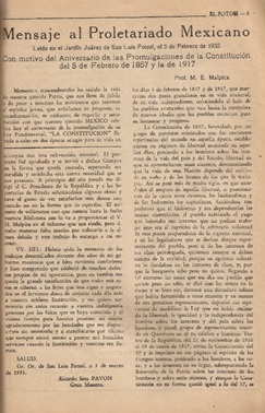 1.- Considerando, que siendo altamente meritoria la labor que ha desarrollado nuestro actual presidente de la República Gral. Lázaro Cárdenas, en favor del gobierno legalmente constituido del pueblo español, que en estos momentos se debate por sostener incólume su institución bajo los principios básicos de libertad, igualdad y fraternidad, contra el imperialismo y fanatismo religioso que son los máximos agresores de todas civilización, este Tall:. [er] pide a esta Resp:.[etable] Gr:. [an] Log [ia] de Estd:. [Estado] que por su conducto se le dé un VOTO de confianza y simpatía a nuestro […] Presidente de la República Gral. Lázaro Cárdenas, a nombre de todas las logias de la obediencia y masonería potosina .