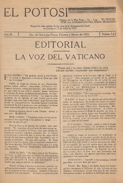 Al momento de pensar la relación directa del Cardenismo con la masonería potosina tenemos que preguntar sobre el tipo de fuentes y las interpretaciones posibles. La invitación es a pensar que lo que pudo llamarse revolución cardenista es, en realidad, la influencia directa en distintos espacios públicos y privados. En este artículo se inicia con la apertura pública de dicha masonería en el estado mediante la edición de Los problemas de la escuela socialista de Manuel Quiroz Martínez, miembro de logia Acción Masónica número 11. La publicación se encuentra repetida en dos ediciones de El Potosí. Revista mensual masónica: una en el año II, de diciembre de 1934 y enero de 1935; otra es del año III, de febrero y marzo de 1935. La revista fue el órgano de difusión del ideal masónico de la Gran Logia de Estado Soberana e Independiente El Potosí. Por el otro, se analizan hallazgos en documentos pertenecientes al Archivo Histórico de dicho espacio. Teniendo en cuenta la tesis de Beatriz Urías Horcasitas1[1], que sitúa a los impresos masónicos con una función específica dentro de la ingeniería social y considerando que el gran maestro del Potosí y el director del impreso, Ricardo Sosa Pavón2, compartían afanes anticlericales e impulsores del movimiento empresarial. La intención general es dilucidar la presencia e influencia de Lázaro Cárdenas en la masonería potosina.