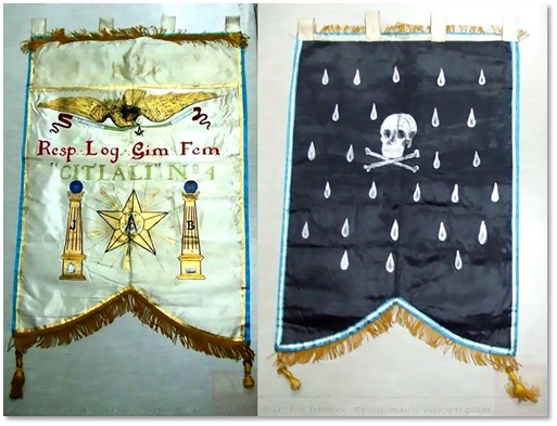 Llama la atención que la unidad de la que forman parte estas dos medallas, está compuesta por 37 objetos, cifra que no concuerda con los 33 que figuran en la descripción. El conjunto de objetos —en su mayor parte medallas masónicas— incluye uno de singular interés: el estandarte de la Respetable Logia Simbólica Femenina Citlali número 4 de México6. La reproducimos a continuación: