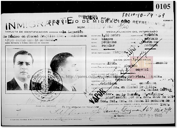 La ficha del registro del Departamento de Migración, dependiente de la Secretaría de Gobernación —que se conserva en el Archivo General de la Nación de México—, indica que arribó al puerto de Veracruz en el vapor Monterrey, en octubre de 1940, procedente de la República Dominicana: