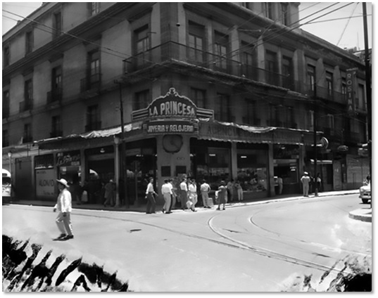La joyería La Princesa fue famosa en la Ciudad de México, al punto que la revista Expansión publicó un artículo, en septiembre de 2011, recordando su importancia en el sector nacional por la comercialización de productos importados13. Se especializó en la venta por catálogo y por la distribución en el resto del país. El artículo hace referencia a la particularidad de que, además de joyas y relojes, vendía violines y vestuario para novias. Por estos datos y la tipología de la joya, consideramos la posibilidad de una procedencia estadounidense. Para finalizar, el texto periodístico alude al reloj que su primer propietario y fundador, el tapatío14 Javier Cacho, colocó sobre la marquesina del escaparate de la empresa —sita avenida Brasil—, resaltando la popularidad entre los ciudadanos. El Instituto Nacional de Antropología e Historia (INAH) conserva varias fotografías, en una de ellas se aprecia el detalle: