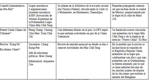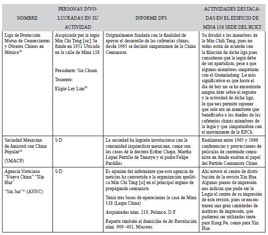 Cuando la DFS inició su vigilancia, se percató que la penetración del PCCh ya había iniciado. Desde el interior de la logia se habían fundado una serie de organizaciones con clara tendencia a los intereses comunistas (ver tabla 1).