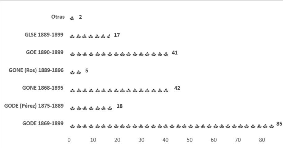 Para los años 1869-1899 se fundaron incontables logias pertenecientes a las grandes logias u orientes de España. Se estima16 que, entre dichos años, un total de 210 logias pertenecientes a más de seis obediencias masónicas (Figura 1), se encontraban distribuidas en las localidades siguientes: Alto Songo (Songo La Maya), Baracoa, Batabanó, Bauta, Bejucal, Bayamo, Cabañas (Mariel), Caibarién, Cárdenas, Cienfuegos, Colón, Corral Falso de Macurijes (Pedro Betancourt, Matanzas), Corralillo, Gibara, Guanabacoa, Guantánamo, San Jerónimo, Holguín, Jovellanos, La Habana, Manzanillo, Marianao, Matanzas, Mayarí, Morón, Palma Soriano, Puerto Padre, Puerto Príncipe (Camagüey), Regla, Remedios, Sagua de Tánamo, Sagua la Grande, Santa Clara, Santa Cruz del Sur, Santa Isabel de las Lajas, Sancti Spíritus, Santiago (Santiago de Cuba), Santiago de las Vegas, Santo Domingo, Trinidad, Victoria de Las Tunas (Las Tunas) y Banagüises (Colón, Matanzas).