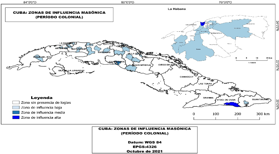 En el mapa de Cuba, sobre zonas de influencia masónica (período colonial), se muestran las logias fundadas durante este período bajo las diferentes obediencias españolas y cubanas que desarrollaron su labor en el territorio nacional (figura 2).