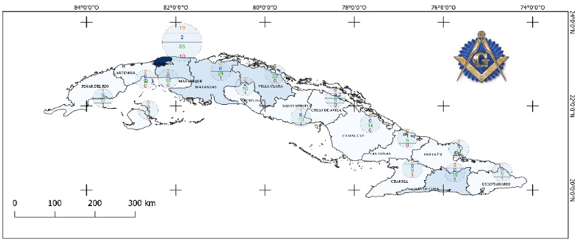 Abstract: The study of the geographic-historical distribution of Cuban Freemasonry will reveal aspects of its influence on the socio-spatial dynamics of the territory and provide a source of information in future geographic-historical and cultural research. It also contributes to foster the development of social and humanistic research on elements of the formation of Cuban nationality and identity. The objective of the article is to describe the geographic-historical distribution of Freemasonry by provinces and municipalities. For its scope, a methodology based on historical geography was used; based on procedures such as: historical and logical, cartographic, data representation and triangulation of sources.