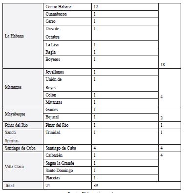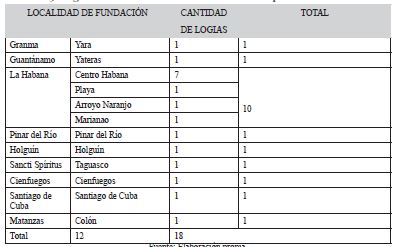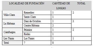 Del período colonial se contabiliza17 la fundación de 39 logias correspondientes a diez provincias y 24 municipios, teniendo en cuenta la división político-administrativa vigente (cuadro 1).