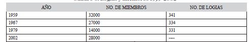 La situación, antes expresada, provocó una contracción en la creación de nuevas logias. Esto se venía apreciando desde poco antes del triunfo revolucionario. En estudio estadístico realizado de la población masónica cubana, entre los años 1960-1980, se apreció una tendencia de esta a disminuir. Este fenómeno se asoció, en esencia, a los cambios políticos ocurridos en el país33. De hecho, al analizar los datos obtenidos se estima un vacío de 37 años, entre 1965-2002, en los que no se fundó ninguna logia. Esto condicionó la disminución del número de masones en proporción con la población del país.