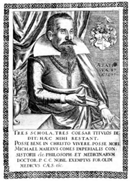 Algunos datos notables pueden rescatarse de la vida de Michael Maier, a modo de muy breve semblanza biográfica. Nació en Rendsburg o en Kiel, Alemania, a finales de la década de 1550 (con especial probabilidad en 1558 o 1559). Su familia era luterana y cercana a la nobleza local gracias al oficio ejercido por su padre: “Goldsticker o Perlsticker: artesano que borda con perlas y con hilo de plata y oro”7. Llevó una vida itinerante que le ganó reputaciones variadas: de sabio, de rosacruz y de espía protestante. Estudió en las universidades de Rostock, Fráncfort del Óder, Padua y Basilea entre 1587 y 1595, de las que obtuvo los grados de doctor en filosofía y doctor en medicina. Ejerció la medicina en Königsberg y estableció su propio laboratorio alquímico en Kiel. Fue cortesano de Rodolfo II en Praga entre 1508 y 1510, el cual le otorgó el título de Conde Palatino. Entre 1511 y 1515 se radicó en Inglaterra, donde aprendió el inglés para poder traducir al latín el Ordinal of Alchemy de Thomas Norton. Entró al servicio de Mauricio de Hesse como consejero y médico personal en 1518. Fue un prolífico autor de obras alquímicas en la última década de su vida, entre 1512 y 1522.
