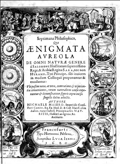 Así, con la Septimana Philosophica Maier se propuso la ambiciosa tarea de desentrañar los más diversos misterios de la creación. El diálogo se articula mediante preguntas y respuestas que van planteándose mutuamente los interlocutores. Estas preguntas, que son generalmente de tipo alquímico y filosófico, reciben el nombre de aenigmata (enigmas) y son las componentes fundamentales de la discusión (fig. 3). En total, la Semana Filosófica compila 319 enigmas, distribuidos entre los seis días de coloquio.