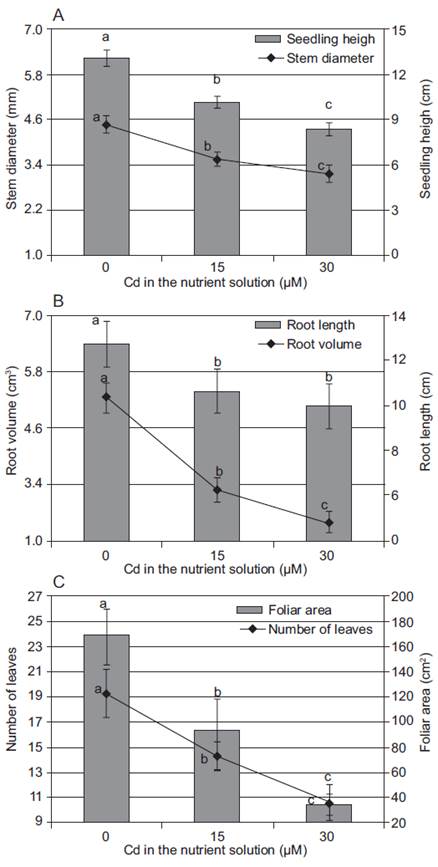 This research demonstrated that the addition of 15 and 30 μM Cd to the nutrient solution significantly decreases plant height, foliar area, chlorophyll content in leaves and the accumulation of N, P and K in different plant tissues. Additionally, the Cd showed the highest accumulation in roots, followed by leaves and stems.