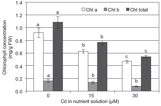 In general, the growth of sweet pepper plants decreased with the increased Cd levels in the nutrient solution. These results coincide with those that have been reported by Chen et al. (2011), who observed gradual reductions in growth and development in mustard (Sinapis alba) and Chinese cabbage (Brassica rapa L. var. rosularis) treated with Cd added to the soil at concentrations of 0-24 mg/kg. These authors reported that the application of 24 mg/kg Cd to the soil, significantly reduced chlorophyll a and b contents compared to the control treatment: chlorophyll a fell by 32.29 and 20.56 % in cabbage and mustard, respectively, while the reductions in chlorophyll b were 21.54 y 21.55 %, respectively.