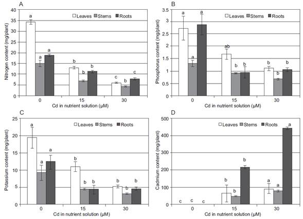 In stems, the macronutrient accumulation decreased significantly in the presence of Cd in the nutrient solution.