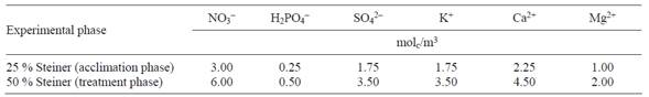 After an eight-day acclimation period, the seedlings established in nutrient solution received the Cd treatments, and the Steiner nutrient solution concentration was increased to 50 % (Table I), supplemented with micronutrients at the concentrations indicated in Table II. Two Cd concentrations (15 and 30 pM) using 3CdSO4 8H2O as a source of this element were used. As a control treatment, plants were irrigated with a nutrient solution without Cd. Cd treatments were applied for 15 days, with the nutrient solution changed every seven days, and every 48 h the water lost through evapotranspiration was replenished and the pH adjusted to 5.3. The nutrient solution was oxygenated using air pumps of 19 L of capacity and timers set to go off every 3 h to provide aeration for 15 min.