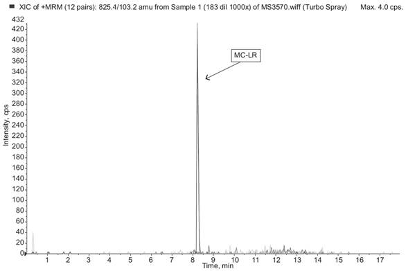 La confirmación de la microcistina-LR se realizó por cromatografía líquida de alta eficiencia (HPLC) acoplada a espectrometría de masas en modo tándem (HPLC-MS/MS), con un HPLC Agilent modelo 1200 y un espectrómetro de masas de marca Apllied Biosystem modelo 3200 Q-trap, bajo las siguientes condiciones: