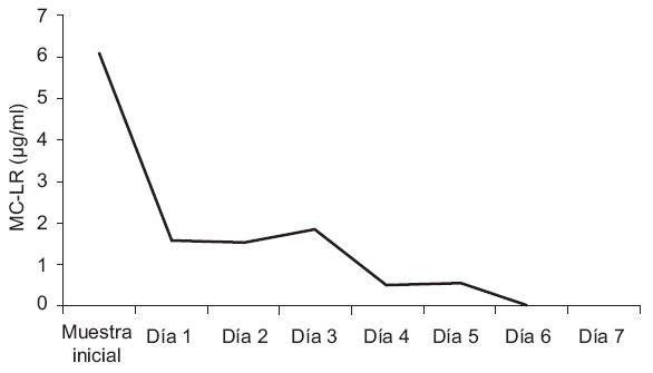 Respecto a los análisis de laboratorio, en el primer ensayo donde se analizó la disminución de MC-LR en una columna en presencia de sedimento, se observó un notable decrecimiento en su concentración (Fig. 3). Durante los primeros tres días de análisis se observó una reducción de 73.1 % de MC-LR. El cuarto y quinto día la reducción fue de 91.7 % y a partir del sexto día no se detectó MC-LR en el sistema evaluado.