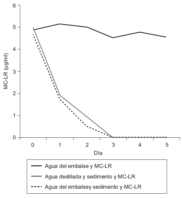 El análisis de la disminución de la concentración de MC-LR con muestras de agua del embalse sin sedimentos no varió en el tiempo, lo que indica la estabilidad de estos compuestos y la contribución de los sedimentos para eliminar la MC-LR del medio acuático. Los datos generados en este estudio sugieren que la reducción significativa de las concentraciones tóxicas puede ser alcanzada a través de procesos naturales y mejorados por medios artificiales.