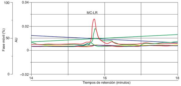 La MC-LR fue detectada usando un cromatógrafo liquido de alta resolución (HPLC Gilson 305 & 306) con detector de arreglo de diodos (DAD). Se utilizó una columna Luna C-18 (4.6 x 150 mm, 5 μm, Phenomenex) con una fase móvil que contenia agua acidificada (0.05 % de ácido trifluroacético (TFA)) en la bomba A y acetonitrilo acidificado en la bomba B, con un gradiente de incrementos desde 10 % hasta 60 % de B por 25 min, seguido por 10 minutos al 100 % de B. Finalmente se volvió a las condiciones iniciales (10 % de B) (Aguete et al. 2003). Se usó un flujo de 1 min y cada corrida tuvo una duración de 40 min. La absorbancia fue monitoreada a 238 nm y los volúmenes de inyección fueron de 20 μL. Para la cuantificación se prepararon cinco concentraciones del estándar de MC-LR. Las diluciones se realizaron con metanol acuoso y las concentraciones fueron (50, 25, 2.5, 1.25 y 0.25 μg/mL). Cada concentración fue inyectada por triplicado en tres eventos diferentes. Tomando en cuenta los tiempos de retención y el área bajo la curva, se realizó una gráfica y se obtuvo la ecuación de la curva para determinar la concentración de MC-LR con el programa Gilson.